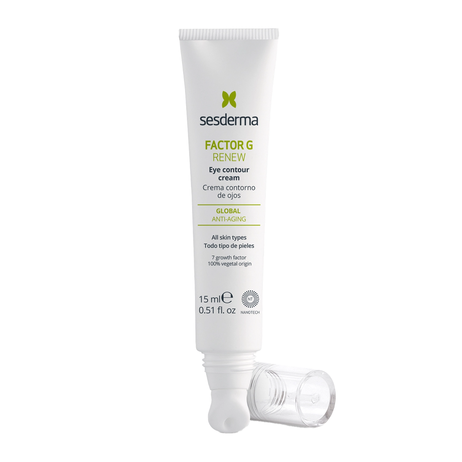 sesderma - Factor G Eye Contour – крем для шкіри навколо очей з антивіковою та зміцнювальною дією. Містить поєднання компонентів з ліфтинг-ефектом, таких як ретиналь та фактори росту. Водночас комплекс компонентів, що освітлюють темні кола під очима, надають погляду свіжий і відпочилий вигляд. Активні компоненти крему стимулюють синтез колагену, підтягуючи шкіру навколо очей, захищають від оксидативного стресу та передчасного старіння клітин шкіри.