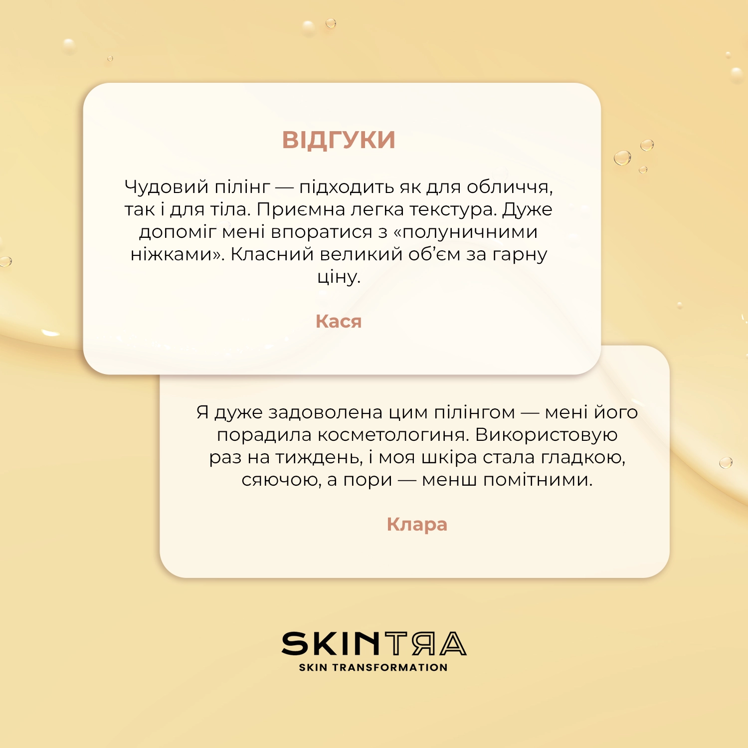 SkinTra - Destructor  кислотний пілінг, призначений для цілорічного домашнього догляду за шкірою обличчя. До його складу входять мигдальна, коєва і транексамова кислоти, азелогліцин та вітамін С. Висока концентрація кислот (24%) активно відлущує, розгладжує та освітлює шкіру. Завдяки властивостям, які пригнічують активність ензиму тирозинази, засіб зменшує синтез меланіну, знижуючи ризик появи нових пігментних плям. Пілінг має також протизапальні властивості, тому ефективно бореться акне. Якщо ваша шкіра має нерівномірний колір, позбавлена ​​блиску, тьмяна, з комедонами та прищами – це ваш мастхев! Цей продукт може здивувати, бо забезпечує помітний ефект косметологічних процедур у домашніх умовах уже після першого використання. Засіб не має фототоксичного і фотосенсибілізаційного потенціалу, а його pH – 2,7. Формула продукту веганська. Кислотний пілінг Destructor отримав нагороду «Перлина косметичного ринку 2022» у категорії «Догляд за шкірою».