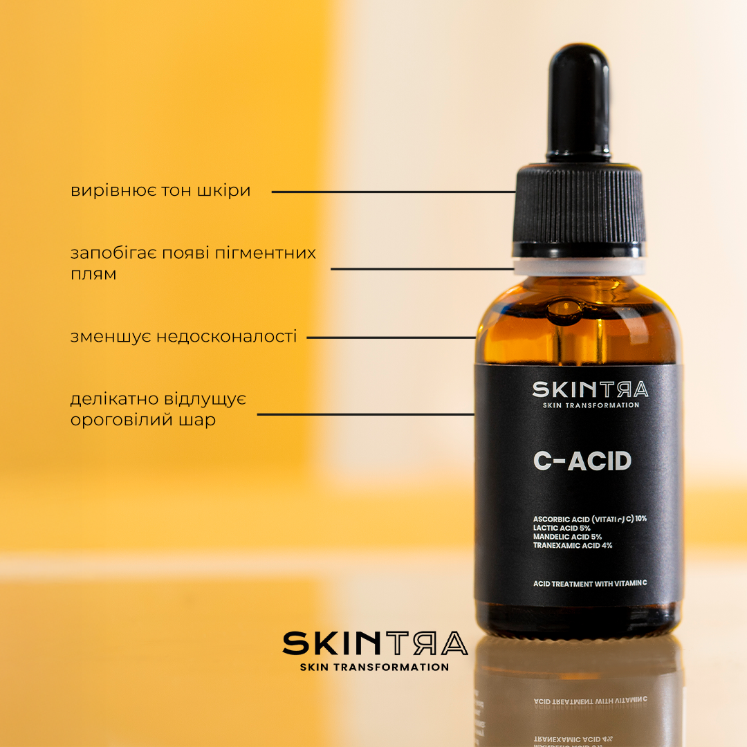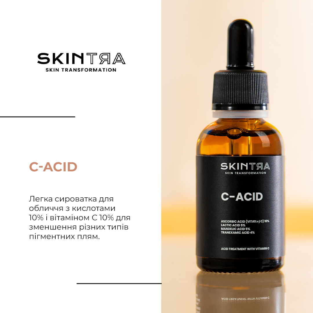 SkinTra - C-Acid  засіб для комплексного догляду за шкірою у формі рідкої сироватки на водній основі для шкіри обличчя, шиї та декольте. Формула містить унікальну комбінацію AHA-кислот у концентрації 10%, аскорбінової кислоти у концентрації 10%, а також транексамової та ферулової кислот. Ця вдосконалена комбінація активних компонентів робить продукт більш делікатним аналогом бестселерів SkinTra Light Your Skin і кислотного пілінгу Destructor. Вітамін С у високій концентрації є ключовою складовою засобу і в поєднанні з феруловою кислотою діє як потужний антиоксидант. Вони нейтралізують шкідливий вплив вільних радикалів, що сприяє зменшенню ознак старіння. Крім того, транексамова кислота, відома своїми властивостями зменшувати запалення, разом із феруловою кислотою підсилюють ефективність вітаміну С. При регулярному використанні засобу шкіра набуває рівного тону і стає сяючою. Також засіб ефективно зменшує недосконалості, мінімізуючи кількість чорних цяток, що сприяє покращенню загального стану шкіри. Це унікальне рішення для догляду за шкірою є простою та ефективною профілактикою пігментації.