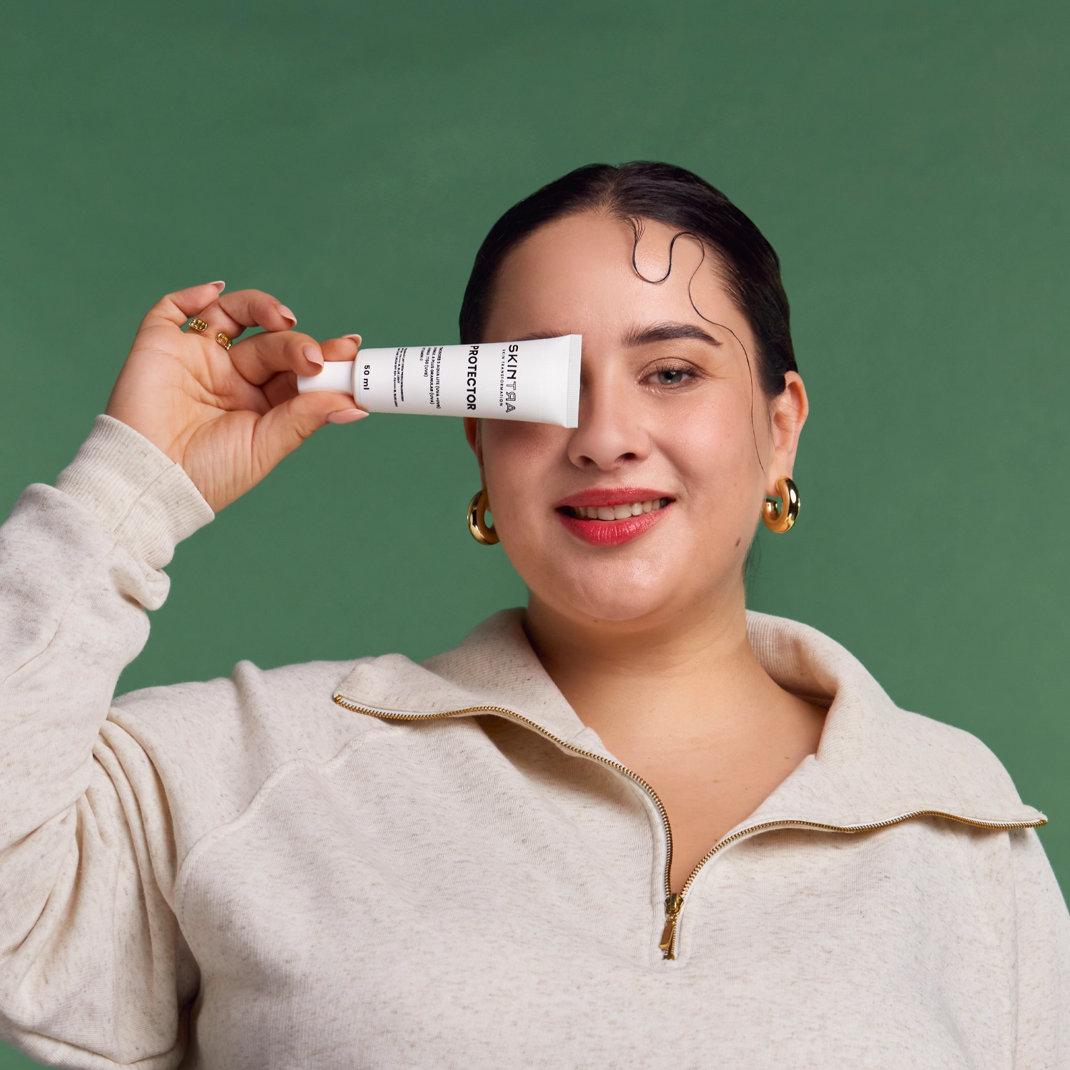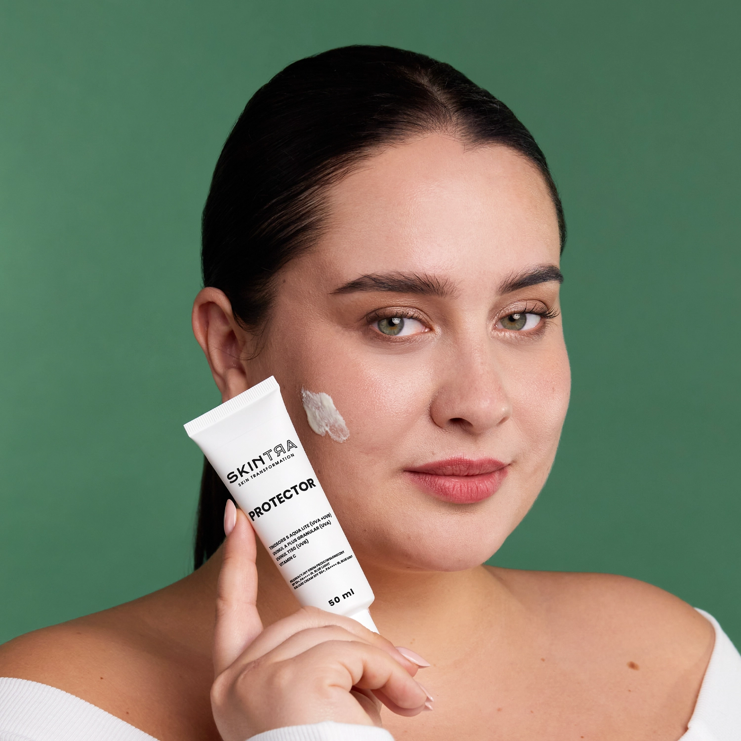 SkinTra - Protector - Доглядовий сонцезахисний крем SPF 50+/PA++++, IR, BLUE LIGHT має сатиновий фініш на шкірі та надає здорове сяйво. Щоб надати більш матового ефекту, рекомендую додатково припудрити лице через 15-20 хвилин після нанесення крему.