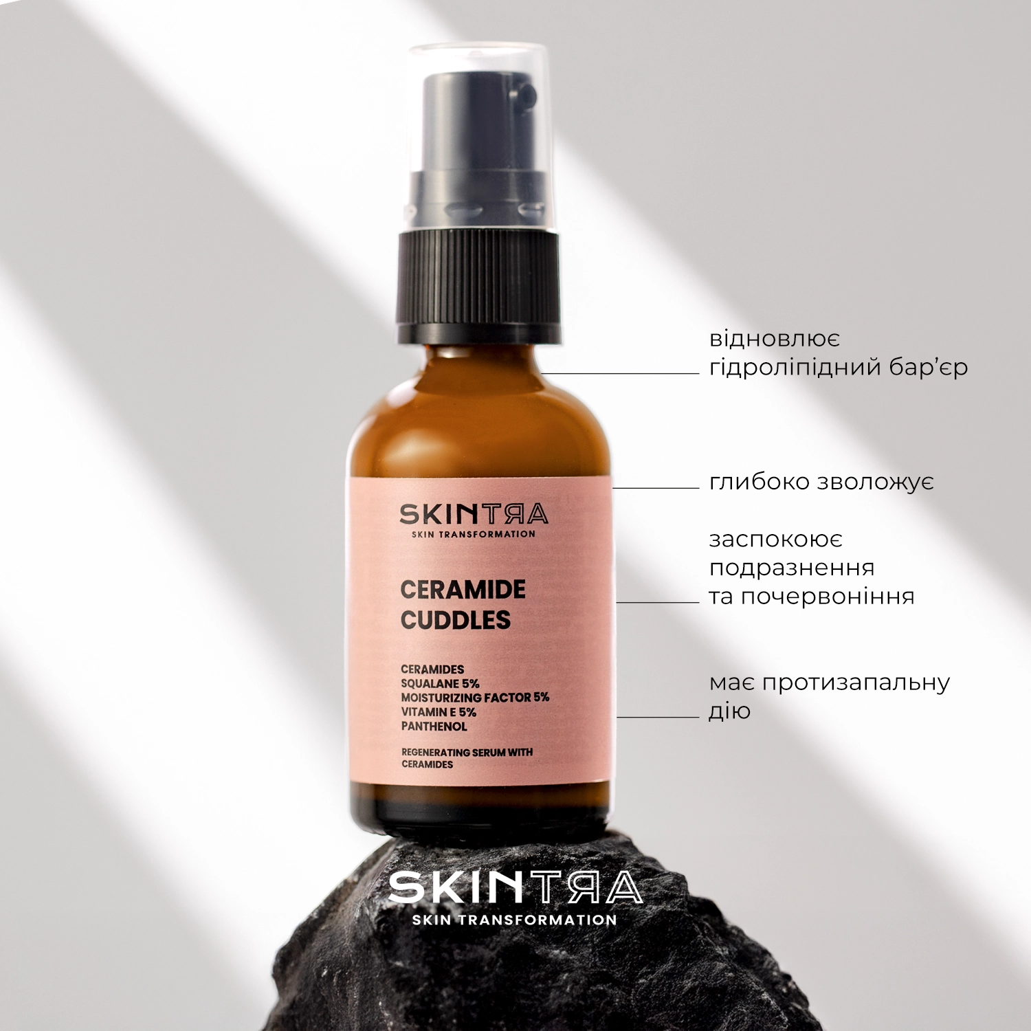 SkinTra - Ceramide Cuddles  регенерувальна сироватка з церамідами, що відновлює порушений гідроліпідний бар'єр. Вона має легку емульсійну формулу, яка залишає приємний сатиновий фініш і добре поглинається, не утворюючи жирної плівки. Продукт не містить ароматизаторів і є гіпоалергенним, тому він підійде для всіх типів шкіри, навіть для чутливої та схильної до алергії. Його також можна використовувати для делікатної шкіри навколо очей. Сироватка дбає про заспокоєння, зменшує почервоніння, зволожує та інтенсивно регенерує шкіру. Своїми винятковими властивостями вона завдячує 2 церамідним комплексам із загальною концентрацією 5,3%, які поповнюють дефіцит міжклітинного цементу та відновлюють ліпідну мантію. Комплекс NMF 5% підвищує рівень зволоження шкіри, сквалан 5% запобігає втраті води з епідермісу, а вітамін Е 5% надає антиоксидантну та регенерувальну дію. Дует пантенолу та алатоїну сприяє процесам загоєння, пом'якшує та заспокоює подразнення. Засіб можна використовувати як вранці, так і ввечері. Він підходить для доповнення догляду за шкірою під час використання сильніших активних компонентів і заспокоює шкіру, подразнену агресивними процедурами.