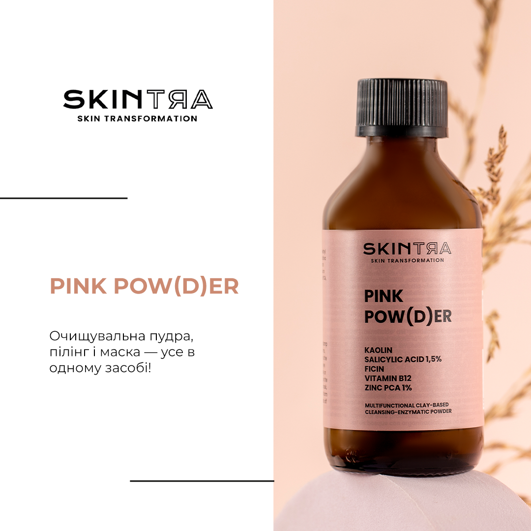 SkinTra - Pink Pow(d)er підходить також для комбінованої/жирної шкіри. Завдяки кислотам (саліциловій, транексамовій, глюконолактону), засіб очищає шкіру від забруднень і чорних цяток, а також сприяє освітленню пігментації, надаючи довготривалий результат.