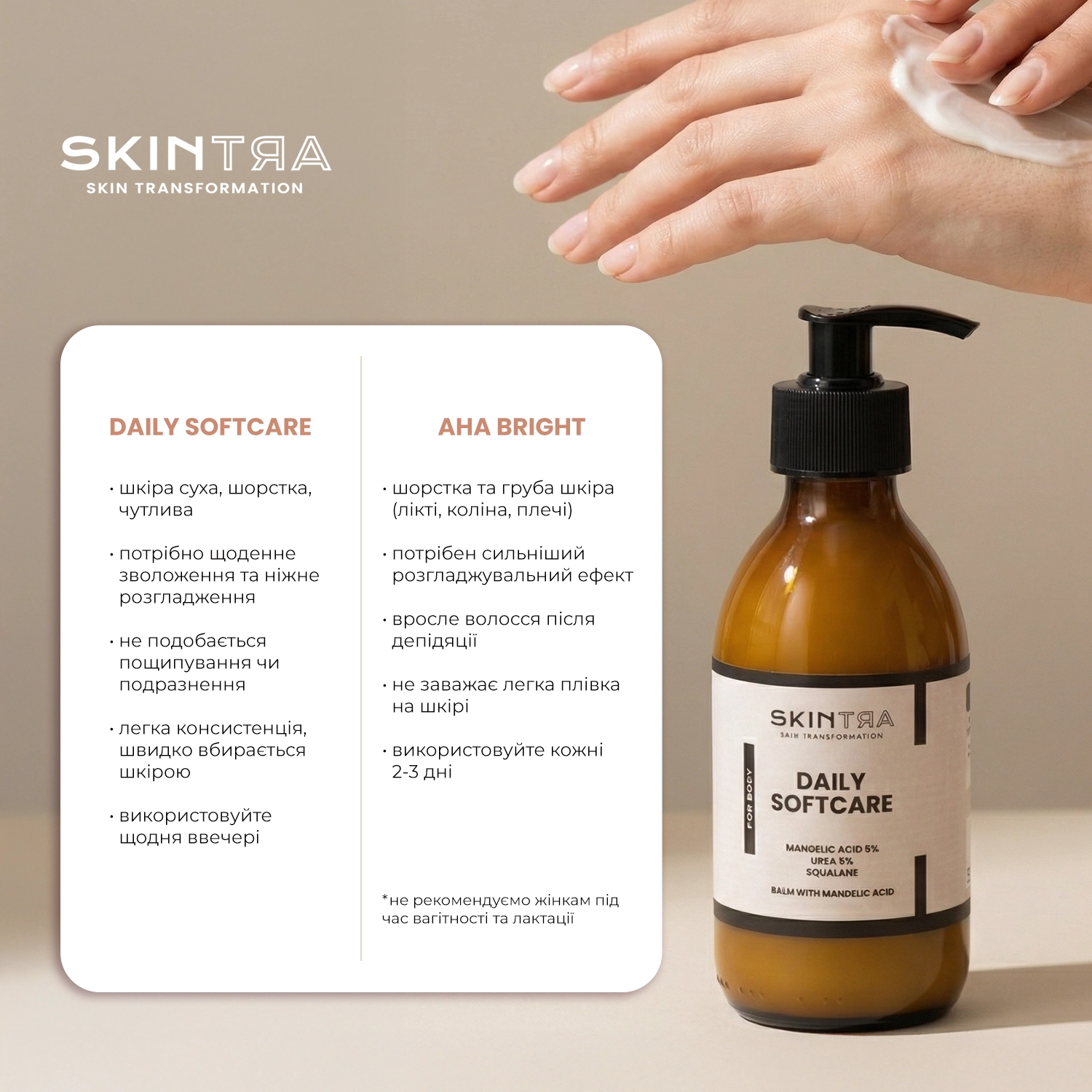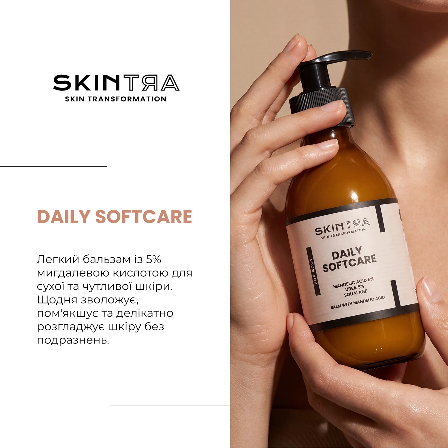 - мигдальна кислота 5% – делікатна AHA-кислота, забезпечує м’яке, поступове відлущування, вирівнює текстуру епідермісу, допомагає боротися з дрібними недоліками на тілі,