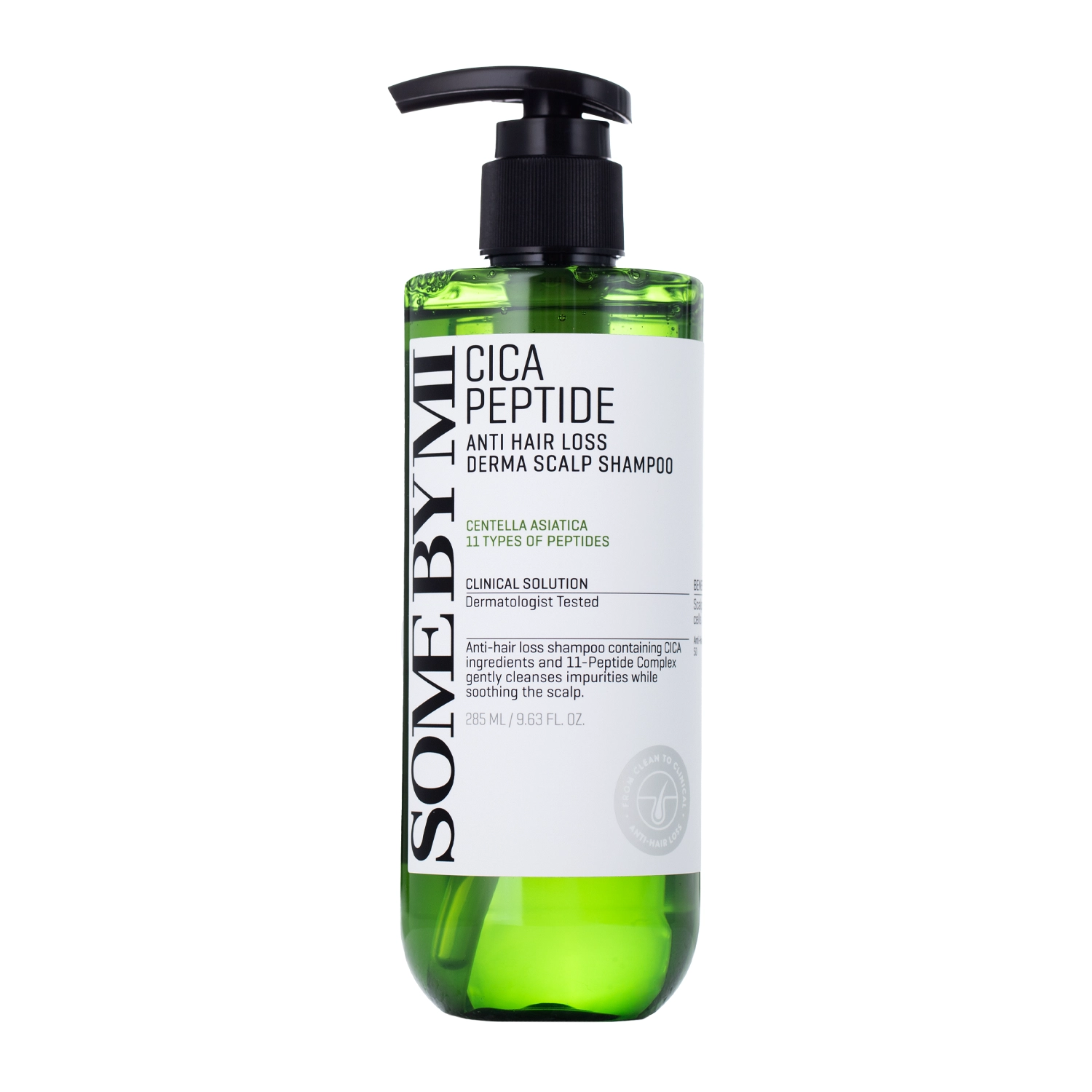 Some By Mi - Cica Peptide Anti Hair Loss Derma Scalp Shampoo - зміцнювальний шампунь з комплексом 11 пептидів, які стимулюють ріст нових пасом, зменшуючи надмірне випадіння волосся. Водночас ніацинамід підвищує еластичність волосся, покращує його структуру і стимулює кровопостачання, що позитивно впливає на живлення і насичення киснем волосяних фолікулів. Також до складу шампуню входять біотин зі зміцнювальними властивостями, протизапальний та регенерувальний екстракт центелли азіатської, а також освіжаючий екстракт м'яти. У результаті шампунь не тільки очищає та освіжає шкіру голови, але й усуває проблему надмірного випадіння волосся, зменшує жирність пасом і підіймає їх біля коренів. Під час використання шампуню можна відчути легкий холод, що зумовлений вмістом екстракту м'яти. Шампунь інтенсивно піниться, легко змивається і має приємний м'ятний аромат. Упаковка з помпою дозує потрібну кількість засобу, необхідну для миття як шкіри голови, так і довжини волосся.