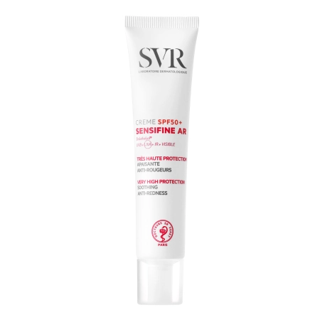 SVR - Sensifine AR Creme SPF50+ - заспокійливий крем з високим ступенем захисту від сонця для судинної шкіри з хімічними фільтрами, що забезпечують захист від UVA і UVB. Крем збагачений комплексом ендотеліола, який зменшує видимість кровоносних судин, еритему і почервоніння, надає профілактичну дію на утворення нових судин і освітлює шкіру. Крім того, в складі екстракт солодки, який знімає подразнення, має антибактеріальні і антиоксидантні властивості, а вітамін Е в свою чергу надає антивікову дію. Гіпоалергенна формула підходить для чутливої, судинної і шкіри, схильної до куперозу.