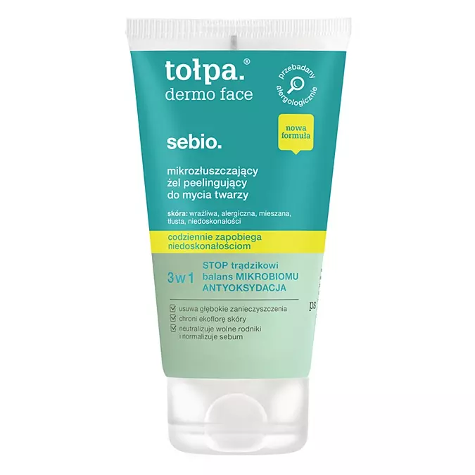 Tołpa - Мікровідлущуючий очищувальний гель для обличчя - очищає шкіру і в той же час нормалізує мікробіом, пригнічуючи ріст бактерій, відповідальних за розвиток акне. До складу входить торф tołpa®, який зміцнює шкіру та діє як антиоксидант. Адаптоген у вигляді екстракту лимонного мирту виявляє дезінтоксикаційну, себорегулюючу та очищувальну дію, а бентоніт відлущує омертвілі клітини шкіри.