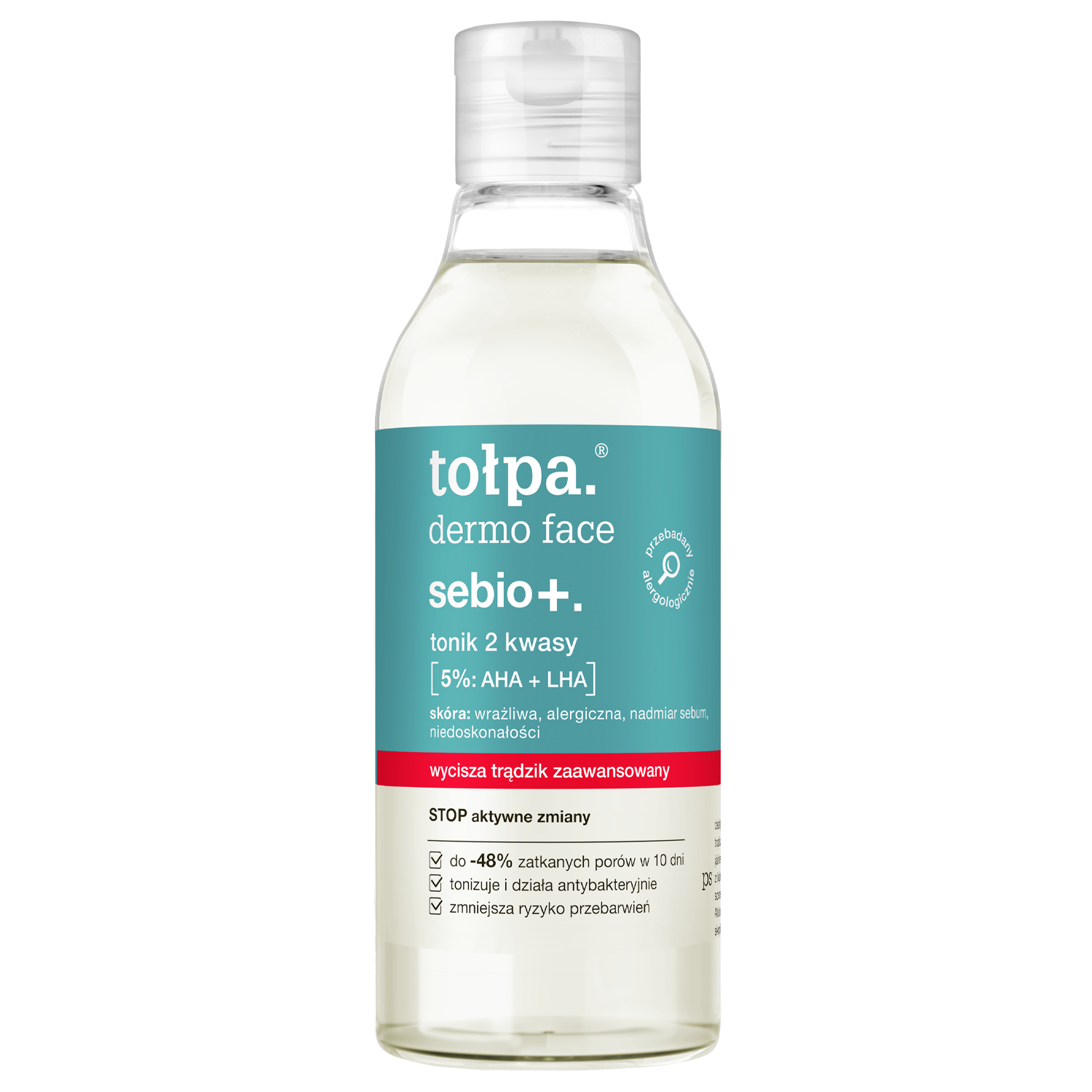 Tołpa - Dermo Face Sebio - тонік для обличчя з протизапальними, себорегулюючими та зволожувальними властивостями, які забезпечують молочна та LHA-кислотаЕкстракт торфу та сік алое заспокоюють подразнення, звужує пори та сприяють зволоженню епідермісу. Екстракт центелли азіатської регенерує епідерміс, зміцнює і робить шкіру більш еластичною. Тонік забезпечує баланс між відлущувальною, заспокійливою та зволожувальною дією, відновлюючи при цьому злегка кислий рівень рН.